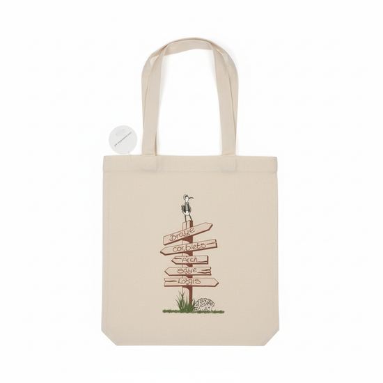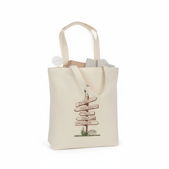 Classic cotton tote featuring the Alderney Signpost design. Durable, lightweight and reusable, perfect for everyday use or as a unique Alderney keepsake. Each design is heat-sealed in-store for a smooth, lasting finish.