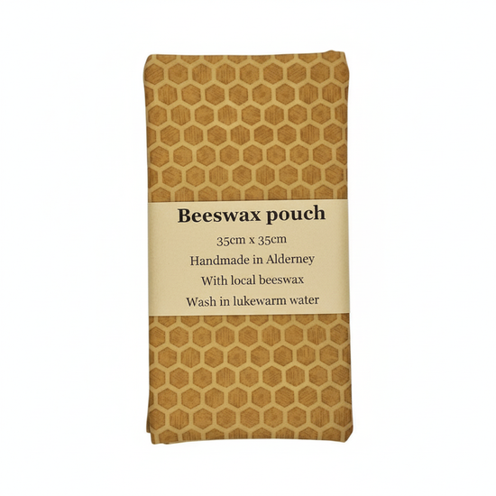 Reusable beeswax pouch, handmade in Alderney with local beeswax. Durable and eco-friendly, perfect for keeping food fresh. Simply wash in lukewarm water and reuse.