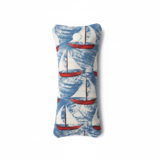 Handmade fabric toothbrush holder with a nautical sailboat design, perfect for keeping your toothbrush clean and protected while traveling. Lightweight, washable and easy to close with a snap button, it’s a stylish and practical travel essential.